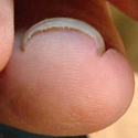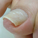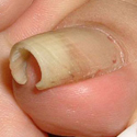 親指の爪に起こる場合が多く、巻き込む形や深さの程度によっては、爪が皮膚に食い込んで炎症を起こすことがあり、それを陥入爪と呼びます。その場合、出血または化膿を併発することがあります。